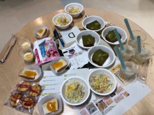 他校からはりんごのクッキー、梅のジャム・ドレッシング・ジュース・チーズケーキが提供され、試食しながら交流して和気あいあいとした時間を過ごすことができました。