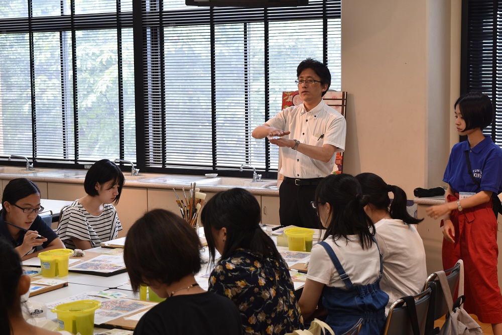 学生スタッフが描いた参考作品を使用し、キャラクターを水彩で着色するポイントをレクチャー!