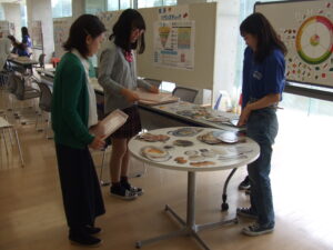 ミニ体験コーナーでは先輩と一緒に食事の栄養バランスについて楽しく体験!