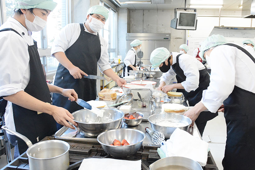 12月21日(火)、生活科学科2年生の調理実習Ⅱでクリスマスケーキを作りました。 学生一人ひとりが考えたオリジナルケーキなので、個性豊かなケーキが完成しました。