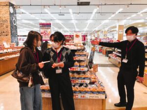 自分たちが考案したレシピがイオンの店内に設置されているのを目の当たりにし、学生たちは感激の様子。