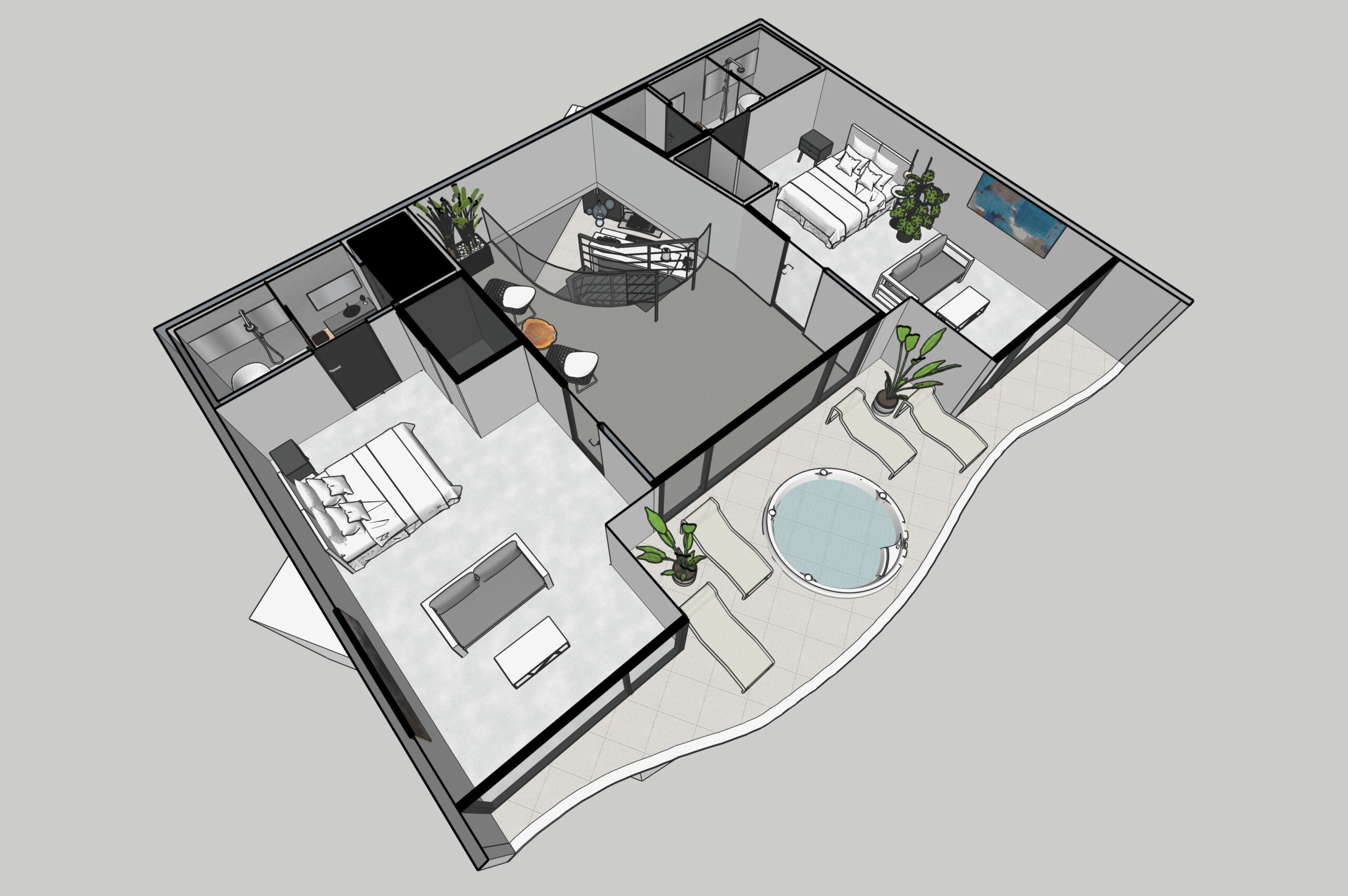 現在自分自身が関わるインテリアを対象に製図表現などの基礎技術を学びます。さらに、そのプランを各自のテーマに応じリファインし、空間化を試み、提案力を養っていきます。